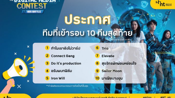 วันจันทร์ที่ 15 กันยายน 2568 – บริษัท โทรคมนาคมแห่งชาติ จำกัด (มหาชน) หรือ NT ประกาศรายชื่อ 10 ทีมที่ผ่านการคัดเลือกเข้าสู่รอบชิงชนะเลิศ โครงการประกวดภาพยนตร์โฆษณา “NT Digital Media Contest 2025 : Ads Battle” ซึ่งโครงการที่จัดขึ้นในปีนี้ มีผู้สมัครทั้งหมด 110 ทีม จากสถาบันการศึกษาทั่วประเทศ