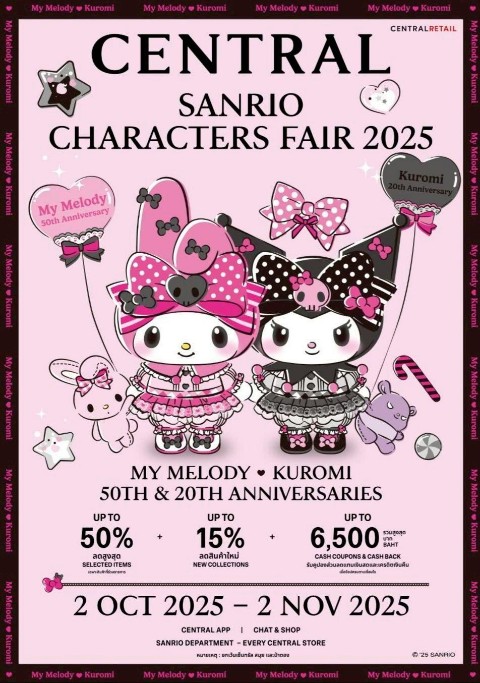o ห้างเซ็นทรัล ในเครือเซ็นทรัล รีเทล ตอกย้ำตำนานผู้นำเข้าซานริโอห้างแรกและรายใหญ่ที่สุดของประเทศไทยคัมแบ็กจัดงานแฟร์สุดคิวต์แห่งปีที่คนรักซานริโอรอคอย “CENTRAL SANRIO CHARACTERS FAIR 2025” (เซ็นทรัล ซานริโอ คาแรกเตอร์ส แฟร์ 2025) ประเดิมที่แรกระหว่างวันที่ 2 ต.ค. 68 – 15 ต.ค. 68 ณ ลานโปรโมชัน ชั้น 1 เซ็นทรัล ลาดพร้าว และสามารถช้อปต่อเนื่องได้จนถึงวันที่ 2 พ.ย. 68 ที่แผนกซานริโอ ห้างเซ็นทรัลทุกสาขา หรือทุกช่องทางการช้อปปิ้งสุดสะดวกของห้างฯ