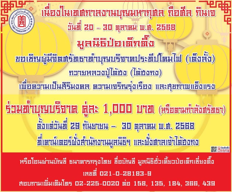 ระหว่างวันที่ 20 – 30 ตุลาคม 2568 มูลนิธิป่อเต็กตึ๊ง โดย นายวิเชียร เตชะไพบูลย์ ประธานกรรมการ ขอเชิญชวนศิษยานุศิษย์และสาธุชนทุกท่าน ร่วมถือศีล อิ่มบุญ อิ่มใจ ละเว้นเนื้อสัตว์ เนื่องในเทศกาลกินเจ ประจำปี 2568 สักการะหลวงปู่ไต้ฮง เพื่อความเป็นสิริมงคล ทำบุญประทีปโคมไฟ (เต็งลั้ง) ถวายหลวงปู่ไต้ฮงเพื่อความเจริญรุ่งเรือง และในวันจันทร์ที่ 27 ตุลาคม 2568 ขอเชิญร่วมพิธีเวียนธูปศักดิ์สิทธิ์รอบนอกศาลเจ้าไต้ฮงกง ขอพรให้คุ้มครอง แคล้วคลาดปลอดภัย ณ ศาลเจ้าไต้ฮงกง มูลนิธิป่อเต็กตึ๊ง พลับพลาไชย กรุงเทพฯ