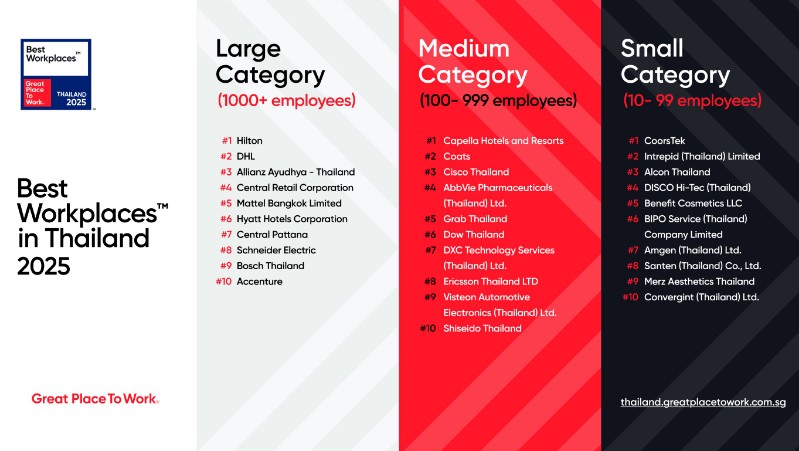 ซึ่งสะท้อนให้เห็นถึงแรงผลักดันที่เพิ่มขึ้นขององค์กรต่าง ๆ ที่มุ่งมั่นในการสร้างวัฒนธรรมองค์กรให้เป็นพื้นที่แห่งความไว้วางใจและมีประสิทธิภาพสูงรายชื่อ Best Workplaces in Thailand 2025 ได้ยกย่ององค์กรที่โดดเด่นจำนวน 30 แห่ง จากสามประเภท ได้แก่ องค์กรขนาดใหญ่ (พนักงาน 1,000 คนขึ้นไป), องค์กรขนาดกลาง (พนักงาน 100-999 คน) และองค์กรขนาดเล็ก (พนักงาน 10-99 คน) ซึ่งองค์กรเหล่านี้ได้กำหนดมาตรฐานสำหรับการสร้างสรรค์สถานที่ทำงานที่มีพื้นฐานอยู่บนความไว้วางใจ, การทำงานร่วมกัน, และความใส่ใจ