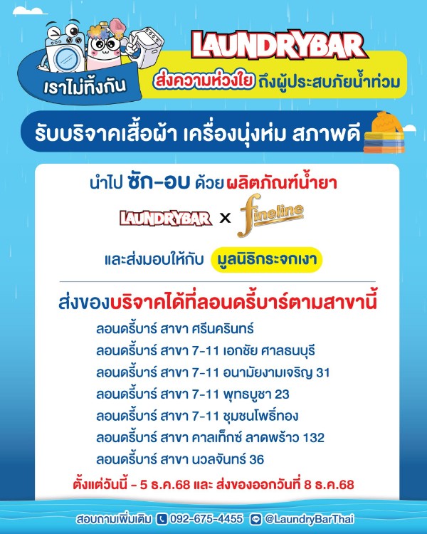ลอนดรี้บาร์ และผลิตภัณฑ์ดูแลผ้าไฟน์ไลน์ (Fineline) ขอเชิญทุกคนร่วมเป็นส่วนหนึ่งในการส่งต่อความห่วงใยครั้งนี้ เสื้อผ้าของคุณสามารถสร้างความอบอุ่นและกำลังใจให้ผู้ประสบภัยได้อีกมากมาย ร่วมบริจาควันนี้ เพื่อช่วยฟื้นคืนรอยยิ้มให้ผู้ประสบภัยไปด้วยกัน