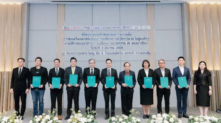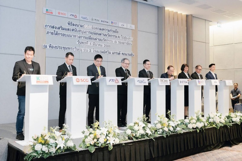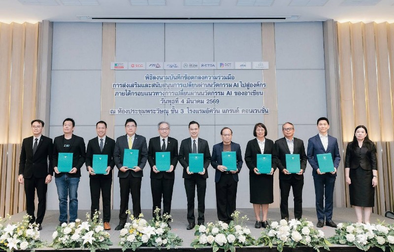 นอกจากนี้ การประชุมสัมมนาเพื่อเผยแพร่ผลการศึกษาของโครงการฯ ยังได้มีพิธีลงนามบันทึกข้อตกลงความร่วมมือ (MOU) การส่งเสริมและสนับสนุนการเปลี่ยนผ่านนวัตกรรม AI ไปสู่องค์กร ภายใต้กรอบแนวทางการเปลี่ยนผ่านนวัตกรรม AI ของอาเซียน จำนวน 9 หน่วยงาน ได้แก่ 1) สำนักงานคณะกรรมการดิจิทัลเพื่อเศรษฐกิจและสังคมแห่งชาติ 2) สำนักงานพัฒนาวิทยาศาสตร์และเทคโนโลยีแห่งชาติ 3) สำนักงานพัฒนาธุรกรรมทางอิเล็กทรอนิกส์ 4) สภาอุตสาหกรรมแห่งประเทศไทย 5) สภาดิจิทัลเพื่อเศรษฐกิจและสังคมแห่งประเทศไทย 6) สมาคมอุตสาหกรรมซอฟต์แวร์ไทย 7) มูลนิธิเพื่อการพัฒนาดิจิทัล 8) บริษัท กสิกร แล็บส์ จำกัด และ 9) บริษัท ปูนซิเมนต์ไทย จำกัด (มหาชน) โดยมีวัตถุประสงค์เพื่อส่งเสริมและสนับสนุนให้เกิดการนำกรอบแนวทางการเปลี่ยนผ่านนวัตกรรม AI ของอาเซียน มาใช้ในการเปลี่ยนผ่านนวัตกรรม AI ขององค์กร และการพัฒนาบุคลากรไทยให้มีความพร้อมในการใช้และพัฒนา AI รวมถึงสร้างเครือข่ายความร่วมมือการพัฒนากรอบแนวทางการเปลี่ยนผ่านนวัตกรรม AI ของอาเซียน ให้รองรับการปรับเปลี่ยนทางด้าน AI และกรอบความตกลงที่เกี่ยวข้องภายใต้ประชาคมอาเซียน ทั้งยังเป็นการร่วมกันแบ่งปัน และเผยแพร่ความรู้ ประสบการณ์การนำ AI มาใช้ในองค์กรอย่างเหมาะสมและปลอดภัย