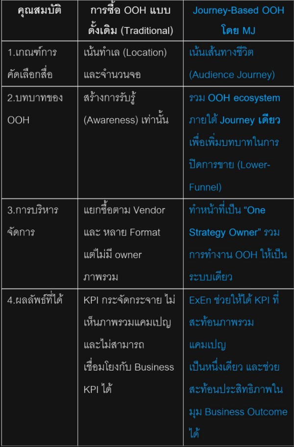• MJ (Master Journey) เปิดตัวในฐานะ “Journey-Based OOH Specialist” ผู้เชี่ยวชาญสื่อ OOH รายแรกที่เน้นการวางกลยุทธ์ ตามเส้นทางชีวิตจริงของผู้บริโภค แทนการซื้อเพียงพื้นที่โฆษณา