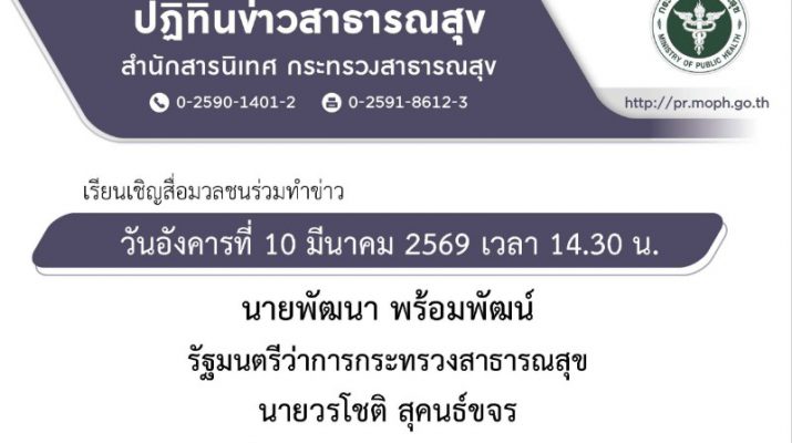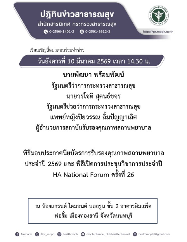 วันอังคารที่ 10 มีนาคม 2569 เวลา 14.30 น.กระทรวงสาธารณสุข เชิญร่วมงานพิธีมอบประกาศนียบัตรการรับรองคุณภาพสถานพยาบาลประจำปี 2569 และ พิธีเปิดการประชุมวิชาการประจำปี HA National Forum ครั้งที่ 26 ณ ห้องแกรนด์ ไดมอนด์ บอลรูม ชั้น 2 อาคารอิมแพ็คฟอรั่ม เมืองทองธานี จังหวัดนนทบุรี http://pr.moph.go.th
