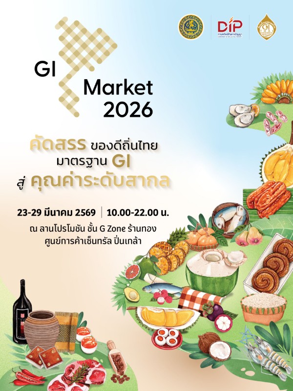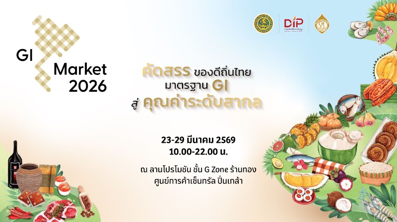 กรมทรัพย์สินทางปัญญา เตรียมจัดงานใหญ่แห่งปี GI Market 2026 คัดสุดยอดสินค้า GI ของดีถิ่นไทย ส่งตรงจากแหล่งผลิต กว่า 70 ร้านค้า เสิร์ฟให้ประชาชนได้เลือกซื้ออย่างมั่นใจ 23-29 มีนาคมนี้ ณ ลานโปรโมชัน ชั้น G ศูนย์การค้าเซ็นทรัล ปิ่นเกล้า