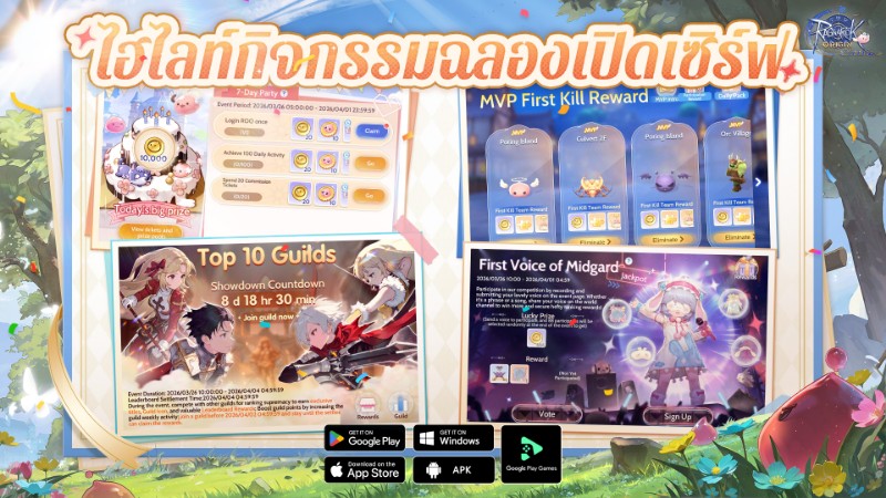 • Top 10 Guild: กิลด์ต่างๆ จะแข่งขันกันอย่างดุเดือดเพื่อชิงอันดับในตารางคะแนนช่วงกิจกรรม ลุ้นรับ Title, ไอคอนพิเศษสำหรับกิลด์ และรางวัลอันดับมากมาย กิลด์ที่จะขึ้นเป็นอันดับ 1 ของเซิร์ฟเวอร์ อาจจะเป็นกิลด์คุณก็ได้